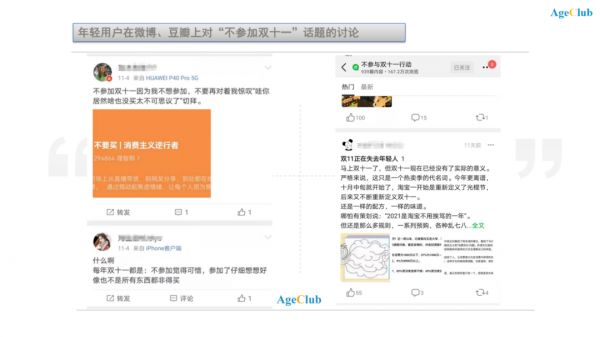 而在今年10.20预售抢购启动后,“不参加双十一”的话题讨论更是席卷各内容社交平台。截止AgeClub发稿前,豆瓣该话题阅读量已破百万,用户分享投稿近千条。