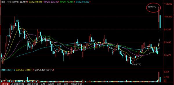 Roblox三季度收入翻倍,周二股价飙升42.23%,涨至每股109.97美元。