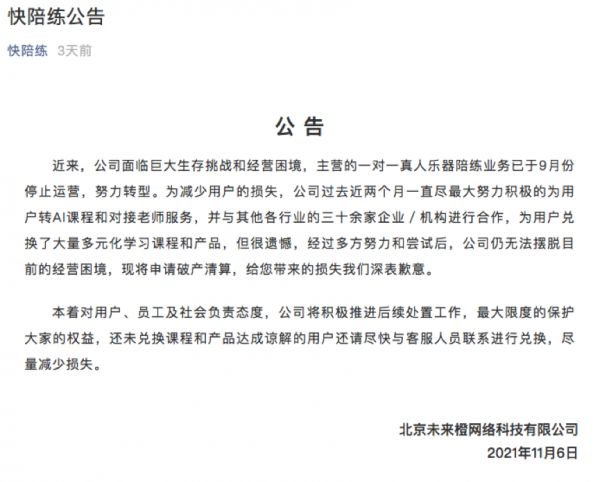 2021年11月6日,公司公告称,为减少用户的损失,公司过去近两个月一直尽最大努力积极的为用户转AI课程和对接老师服务,并与其他各行业的三十余家企业/机构进行合作,为用户兑换了大量多元化学习课程和产品,但很遗憾,经过多方努力和尝试后,公司仍无法摆脱目前的经营困境,现将申请破产清算。