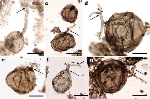 最近,在加拿大北极圈内的一个地区,来自比利时和加拿大的研究人员在页岩中发现了一些微生物化石标本,而这些化石大约已经有10亿年历史了。他们从化石中检测到了几丁质,提取出已成为化石的真菌孢子和菌丝,这使得研究人员开始相信,这些在10亿年前变成了化石的微生物就是真菌。