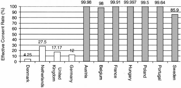 图中,横坐标最左边四个国家体现的是明确同意(explicit consent),而右边七个国家则体现的是假定同意(presumed consent)。