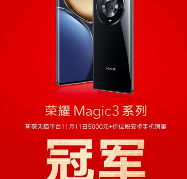官方数据显示,截至11月11日23 : 59,荣耀高端旗舰手机收官大捷,斩获重量级冠军。其中,荣耀Magic3系列摘得11月11日天猫、京东5000元+价位段安卓手机销量冠军;荣耀50斩获天猫11月1-11日累计2500-4000元价位段手机单品销量冠军;荣耀50系列斩获11月11日京东2500-4000元价位段手机销量冠军。