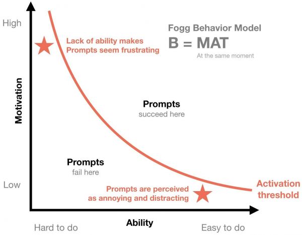 福格提出,任何一个行为的发生,都需要同时满足以上三个要素——人们需要有产生行为的动机(Motivation)、要有能够实施行为的能力(Ability),以及一个合适的提示(Prompt)。如果没有发生行为,则这三要素至少缺少了一个。