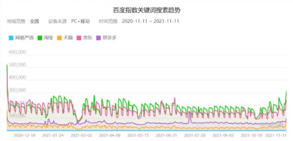 百度指数显示,从去年双十一到今年双十一的一年间,网易严选在几个电商平台的搜索量一直垫底。海豚智库行业调研的数据表明,在2018年排名第六的网易严选,如今已经掉落20名开外。
