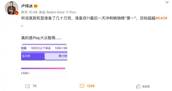 “听说某款机型准备了几十万货,准备双11最后一天冲刺畅销榜“第一”,目标超越K40 。真的是Play大众智商……。”