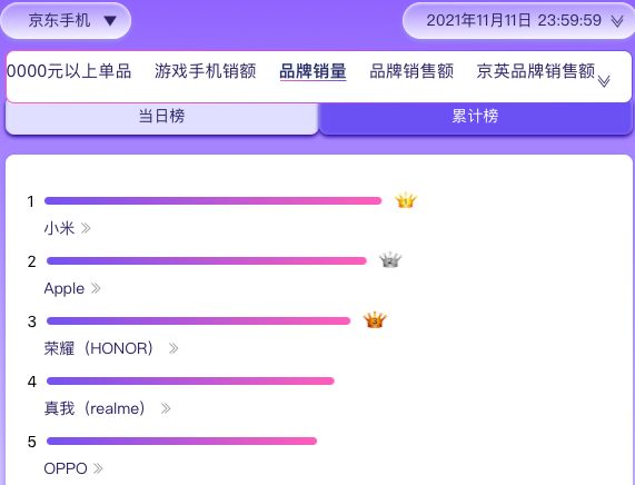 来自京东平台数据显示,仅10分钟,小米、iQOO、OPPO、荣耀、华为、三星、vivo品牌手机成交额同比增长4倍;苹果销售额破百亿。随后,各家都宣布了自己各种维度的胜利战报。