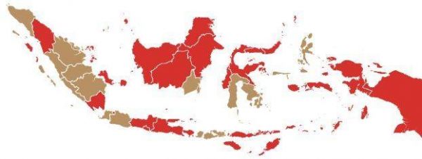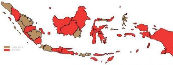 其实很多人没有注意的是,佐科这场选举赢得并不轻松。下面两张图代表了印尼这两次大选政治版图的变迁。红色代表佐科获胜的省份、而褐色的则被普拉博沃拿下。