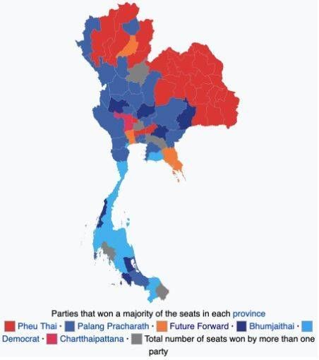 从下图可以看出来,支持他信的为泰党(红色)在东部和东北部的农村地区还是有绝对优势的,军方的人民国家力量党则在中部打出了一片蓝天。泰国高峰集团公子塔纳通(中文名庄海文)2018年创立的、代表城市中产和年轻人的未来前进党则出乎意外的成为议会第三大党。