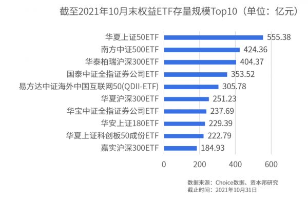 截至今年10月末,市场合计23只权益类ETF基金(混合型、股票型、其他型)规模超百亿。其中,华夏上证50ETF以555.38亿元的规模位居榜首,南方中证500ETF、华泰柏瑞沪深300ETF的规模均超400亿元。