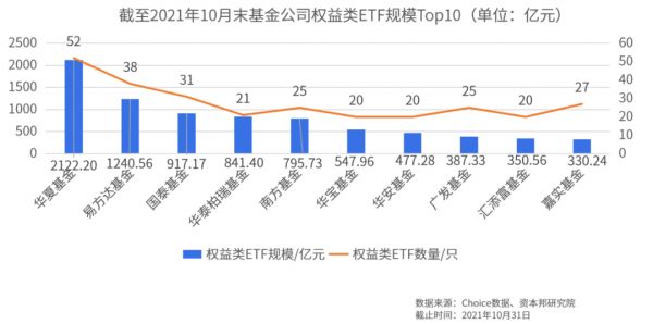 2021年10月,26家基金公司权益类ETF规模实现了一定增长。其中,易方达基金单月规模上涨超百亿元,华夏基金规模增量也均超70亿元。