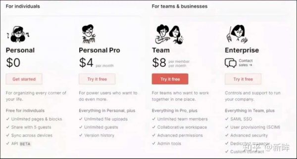 据了解,Notion也曾尝试向C端用户收费。例如,其一种版本是Personal Plan,就是免费的,而Personal Pro则是收费的,甚至免费的版本,限制用户上传的文件大小小于5M,邀请guest不超过5 个,而且不能保存版本历史API。