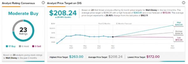 目前华尔街较为看好迪士尼。眼下有约74%的分析师予迪士尼“买入”评级,且没有分析师给出“卖出”评级,平均目标价为208.24美元。