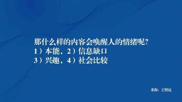 那什么样的内容会唤醒人的情绪呢?根据调查得出结论有四个方面:1)本能,2)信息缺口;3)兴趣,4)社会比较