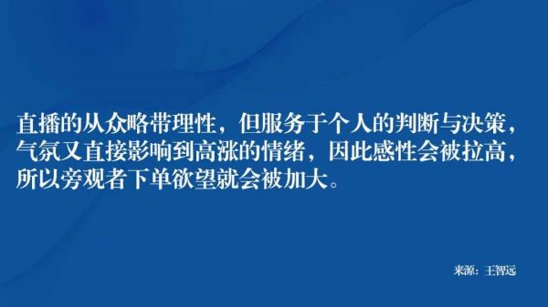 进一步说,直播的从众略带理性,但服务于个人的判断与决策,而气氛又直接影响到高涨的情绪,因此感性又会被拉高,所以旁观者下单欲望就会被加大。