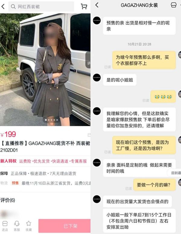 “对于预售,商家也受诸多原因限制。但你很难跟购买者解释,他们只会觉得‘为什么要等那么久才发货,你是收到订单才开始种棉花吗’。”店铺正上着预售服装的店主京京苦笑道。