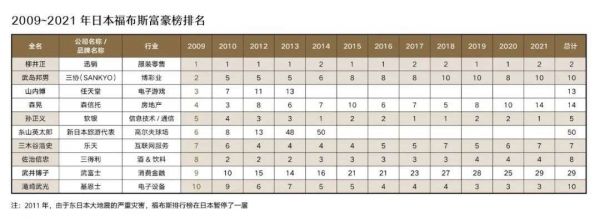 日本的财富更迭很稳定,富豪榜的排名变化也是缓慢的、渐进的,以2009年~2021年的福布斯富豪榜前十位为例,12年前的10位富豪中,有6位一直留在榜单,而同期中国的福布斯富豪榜,只有腾讯公司创始人马化腾一人能始终在榜。