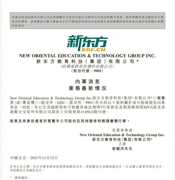 11月15日, 新东方(09901.HK)发布公告称,计划于2021年底前停止全国所有学习中心的K-9学科辅导服务。