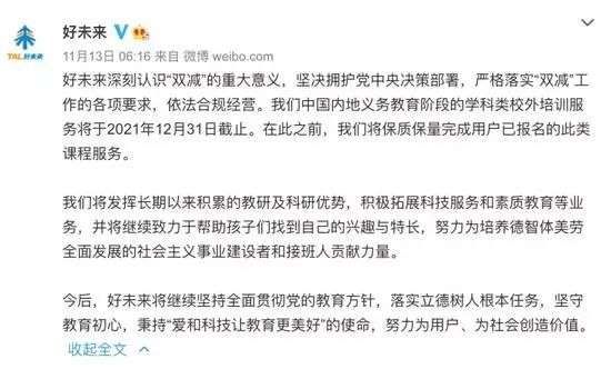 13日早间,好未来发表声明称,中国内地义务教育阶段的学科类校外培训服务将于2021年12月31日截止。在此之前,将保质保量完成用户已报名的此类课程服务。