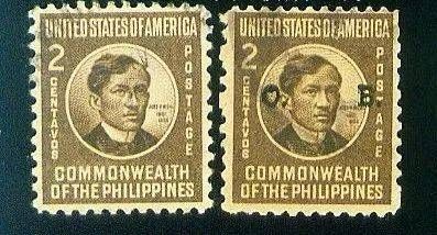 ▲印有菲律宾国父黎萨尔肖像的信销2枚