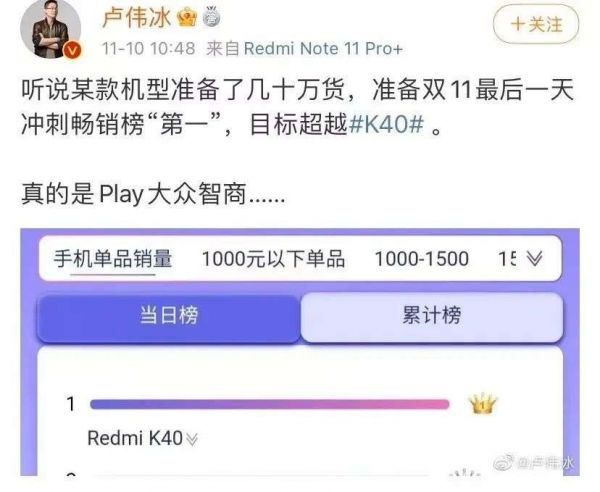 11月10日,Redmi品牌总经理卢伟冰发博称:“听说某款机型准备了几十万货,准备双11最后一天冲刺畅销榜“第一”,目标超过Redmi K40,真的是‘play’大众智商。”
