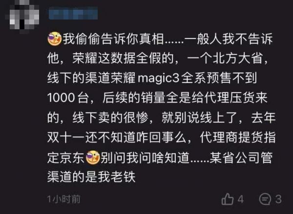 在一篇讨论荣耀第三季度增速的帖子下,一名ID名为“说唱数码”的贴吧网友透露自己朋友是一家省公司渠道管理,他表示:“一个北方大省,线下渠道荣耀Magic3全系预售不过1000台,后续销量全靠代理商压货。”