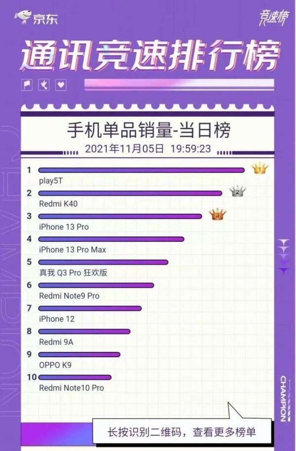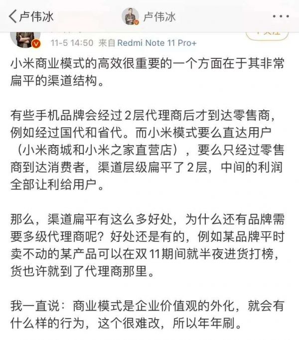 10月5日,卢伟冰发布一条微博向网友科普小米的“扁平”渠道,并同时暗示其他品牌“暗箱操作”的可能性:“某品牌平时卖不动的某产品可以在双11期间半夜进货打榜,货也许就到了代理商那里。”当日,京东手机通信销量榜榜首恰好为荣耀play5T。