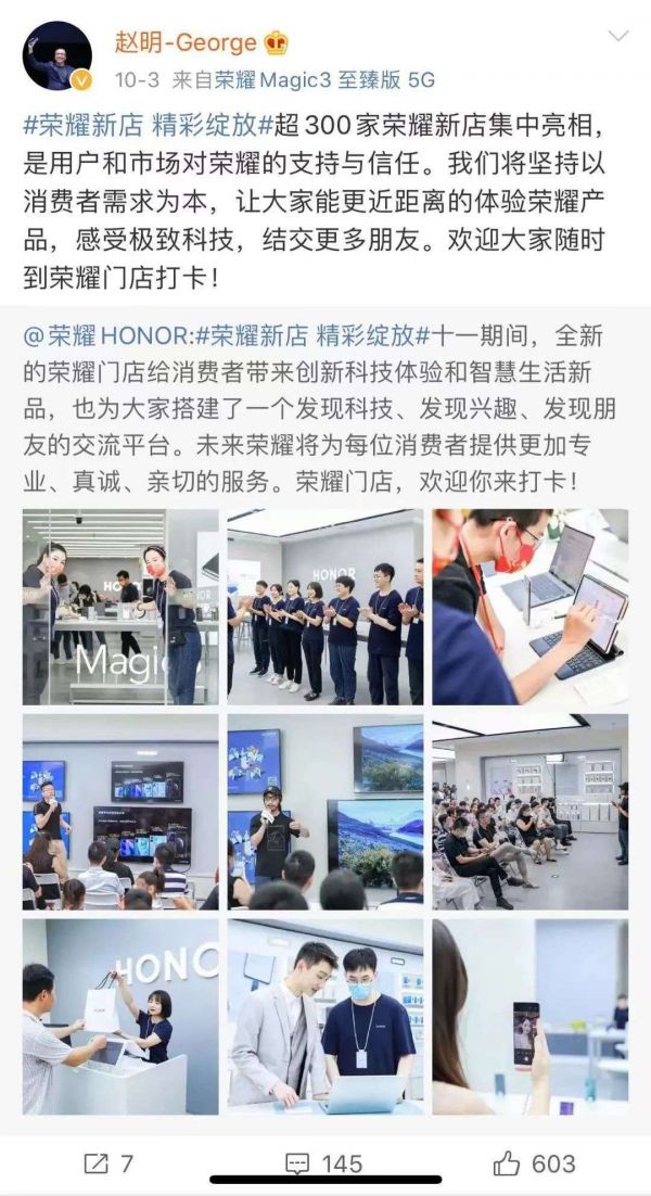 在线下布局上,老牌厂商OV分别拥有超过20万家店铺,荣耀也在暗中发力。10月3日,赵明在微博宣布超300家荣耀新店集中亮相。在8月份荣耀Magic3发布会上,他透露,截至8月底,荣耀体验店数量比年初增长68%。