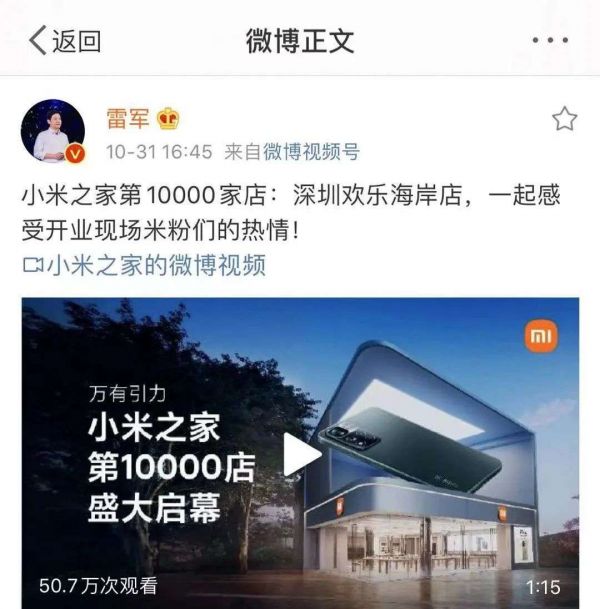 10月30日,小米CEO雷军在微博上宣布,小米第10000家小米之家在深圳欢乐海岸开业。