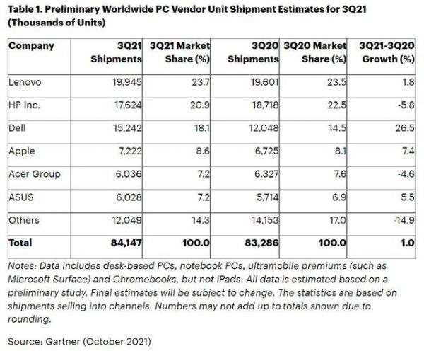 Gartner发布了2021年第三季度全球PC市场统计的报告。根据相关数据显示,截至2021年Q3季度,联想以23.7%的市场份额稳居全球第一,惠普以及戴尔位列二三,苹果则以8.6%的市场份额排在第四位。