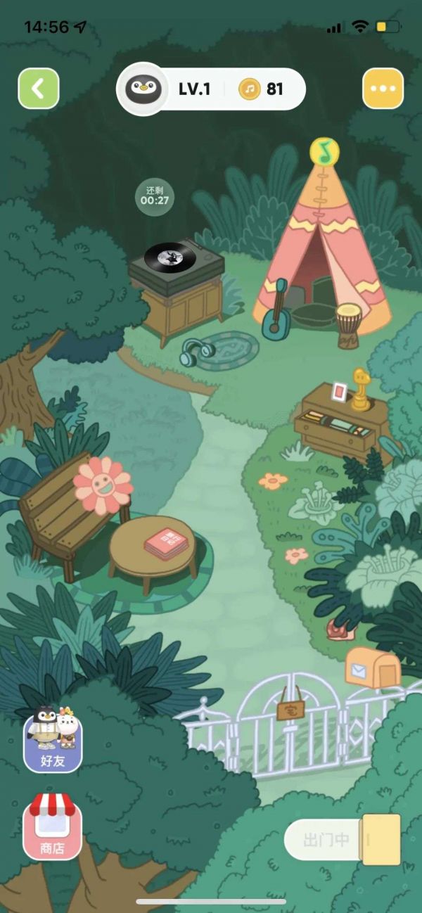 在主界面中,上方的黑胶机会显示QQ音乐当前正在播放的音乐,点击还能打开简单的播放控件。右边的柜子可以看到已经获得的道具和食物,下方的信箱可以看到好友发来的消息,而左侧的躺椅则是宠物不出门时休息的地方,点击可以看到宠物出游“看演出”时拍下的照片。