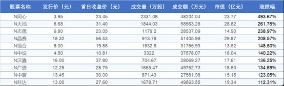 其中,表现最为亮眼的当属10只新股,上市首日股价全部翻倍。截至收盘,10只新股平均较发行价上涨199.80%,市值累计增加130亿元。