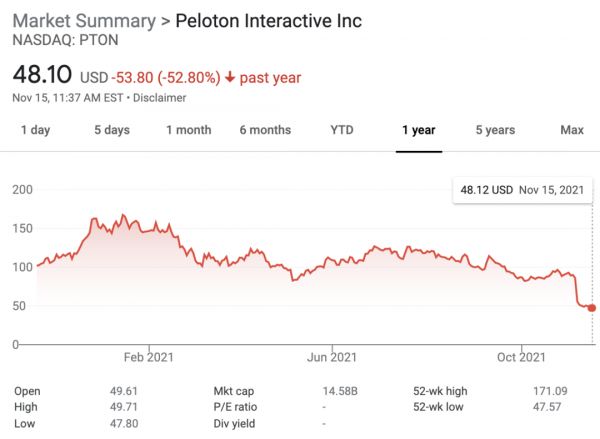 Peloton市值过去一年缩水53%,股价持续下跌。