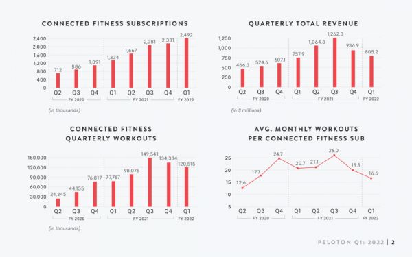 FY2022Q1财报显示,Peloton营收连续两个季度下跌。