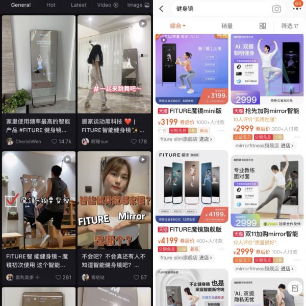 小红书(左)和淘宝(右)上“健身镜”的搜索结果
