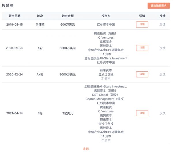 虽然曾被媒体曝出内斗传闻,但这丝毫不影响其在资本市场的受欢迎程度。这家成立于2020年9月的公司,在两年内拿了四笔融资,腾讯、红杉中国、金沙江、蔚来资本等明星资本悉数在列,估值一度达到15亿美元,一跃成为独角兽。