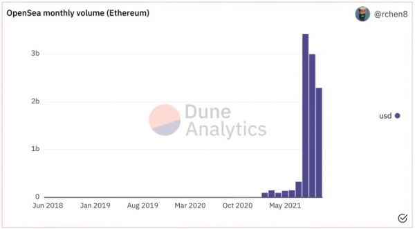 它也在重塑艺术和文化。在过去三个月的时间里,光在 OpenSea 这里,就有超过 50 万人花了90多亿美元在 NFT 上面。