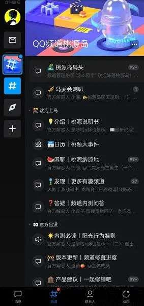 据悉,QQ目前正在内测QQ频道功能,并且其或将替代看点成为QQ第二个底部Tab栏的功能。目前,QQ中对QQ频道的介绍,是"娱乐协作新方式"。然而从已经曝光的截图来看,在UI设计上QQ频道几乎就是国内版的Discord,有着经典的主界面纵向四分割,以及自定义频道、聊天机器人和频道成员页。