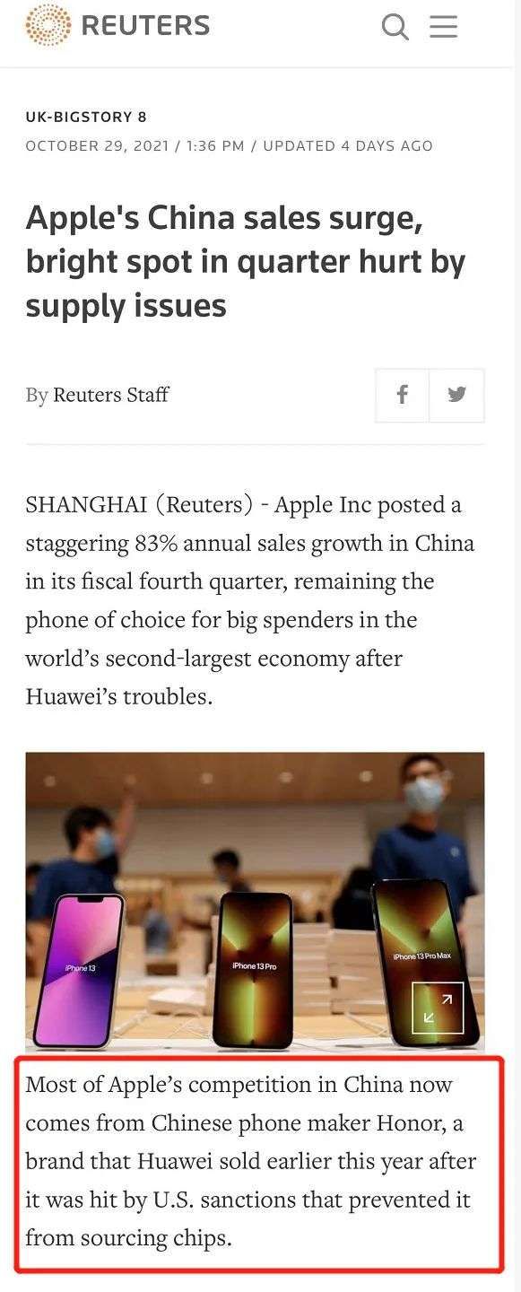 不过外界呼声最高的对手仍是脱离华为独立运营的荣耀,比如路透社在报道中直言“苹果在中国的最大竞争对手是荣耀”。