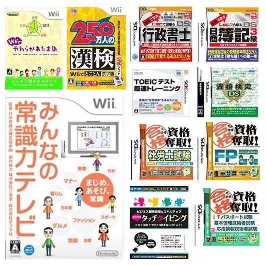 在WII、PS、DS等游戏主机上,如上所示的教育类游戏软件多如牛毛,内容从汉字、英语、IT、到科学常识、甚至会计、宅建士、行政书士等职称教辅……包罗万象。