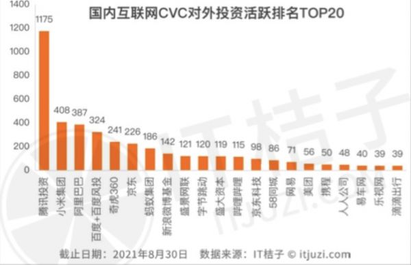 今年截至目前,《2021年中国CVC投资并购报告》披露的数据,腾讯累积对外投资数量达到1175起,约是第二名小米集团的3倍、第十名字节跳动的10倍。