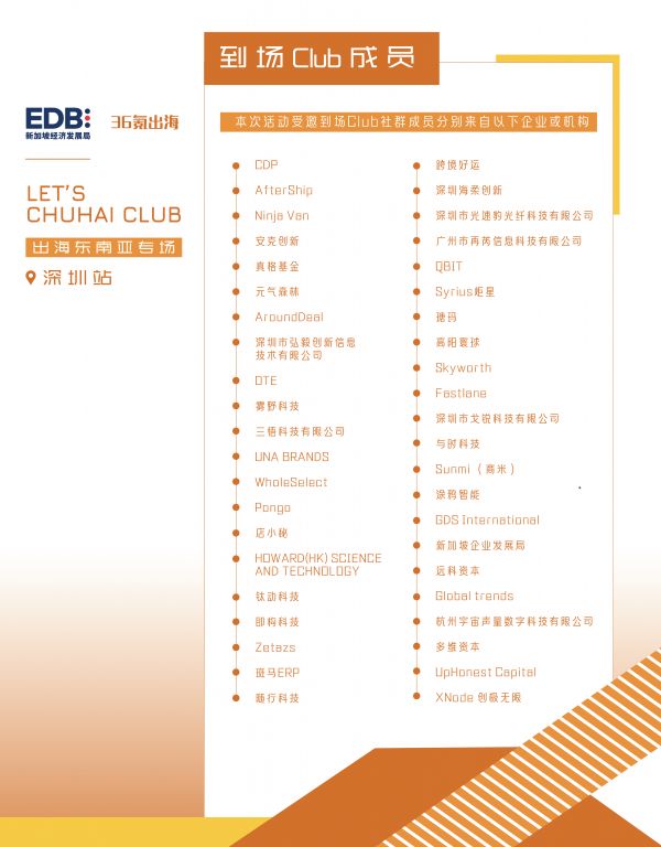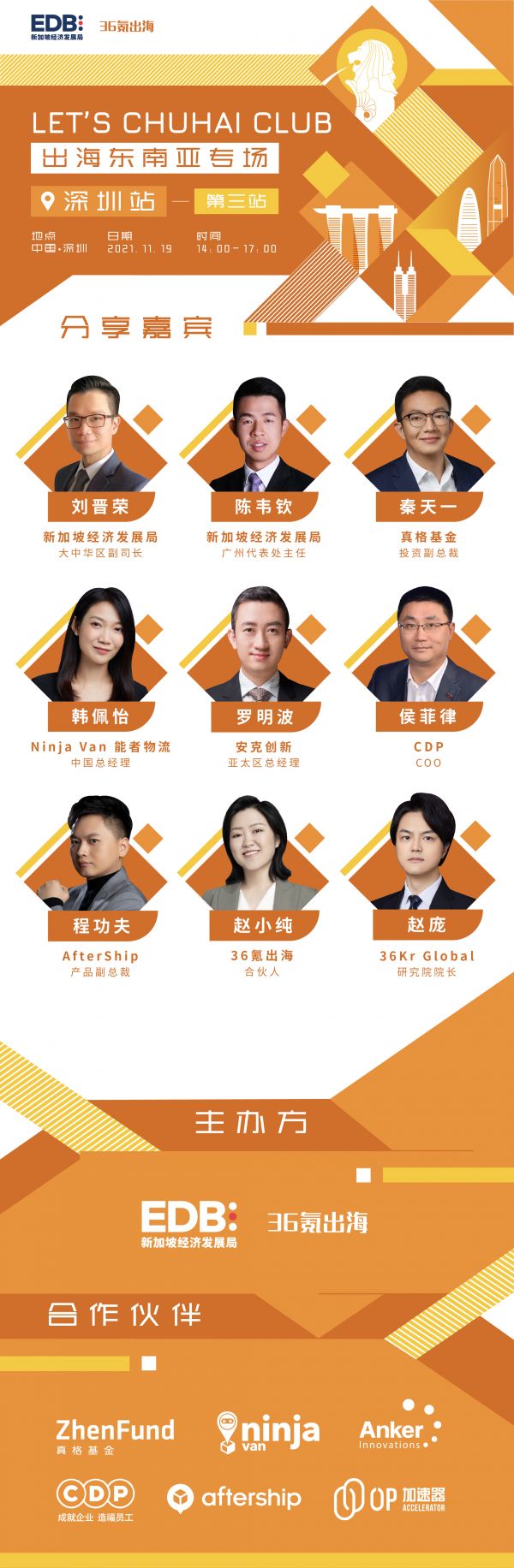 由新加坡经济发展局(经发局 EDB)与36氪出海联合主办的“LET'S CHUHAI CLUB-出海东南亚系列沙龙” 第三站,我们于11月19日将来到中国跨境电商的启航地、SaaS 产品的排头兵——深圳。在大湾区的出海圈中提供有价值的交流平台,与身在其中的玩家共同面对实际的行业问题。
