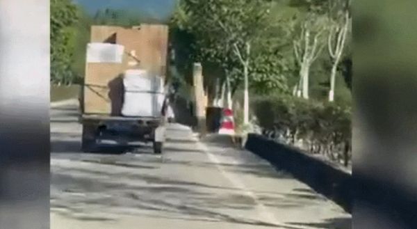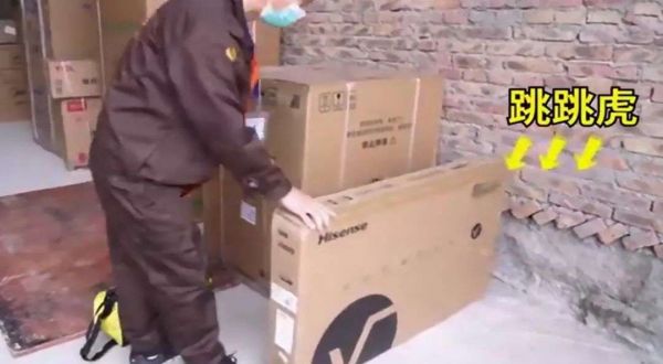从快手发布的视频可以清楚地看到,电视机从货车上掉下,包装箱腾空跳跃,像体操运动员一样转了好几圈才落地。小货车车主发现后,立马停车下来抱起电视机往回走,在抱起电视机的那一霎,我们看到外包装左上角的logo为Hisense,我们知道它是中国家电品牌海信,包装盒中间显示“Vidda”,这又是什么意思呢?