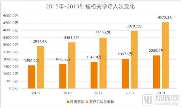 2015年-2019年肿瘤诊疗人次变化,数据来源:《中国卫生健康统计年鉴》,动脉网整理制图