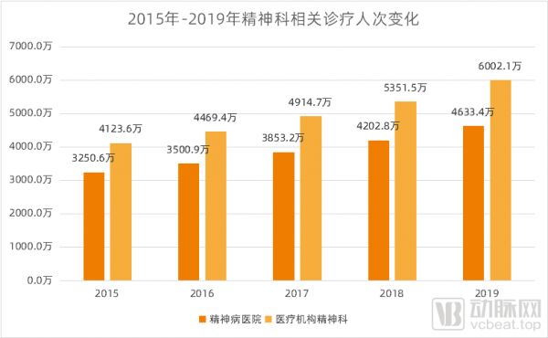 2015年-2019年精神科诊疗人次变化,数据来源:《中国卫生健康统计年鉴》,动脉网整理制图