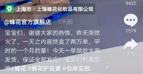 但突如其来的热搜,给蜂花带来了一笔意外的流量,蜂花官方也在直播中称,“谢谢大家的热情,昨天突然火了,一天之内居然卖了两万单,平时的一个月的量!”