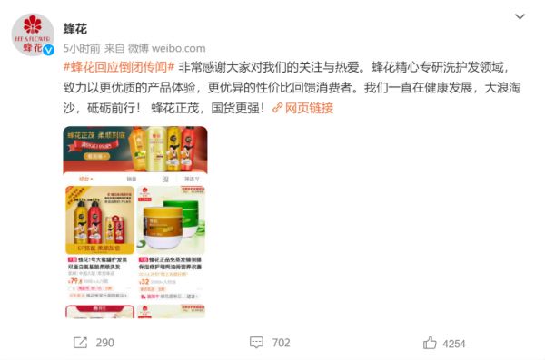 11月15日下午,蜂花官方视频账号更新了一则宣传片否认倒闭,“大家不用担心,我们没有倒闭,谢谢大家!”