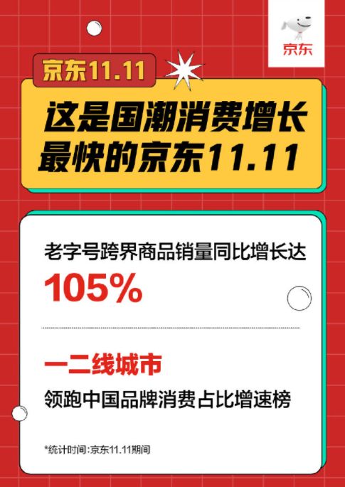 京东方面也称,这是国潮消费成长最快的“双十一”,4小时内,老字号跨界商品销量同比增长达105%,其中一二线城市领跑中国品牌消费占比增速榜。