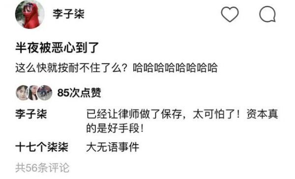 8月30日,李子柒账号在半夜发布一条动态,文案内容显示:“半夜被恶心到了,这么快就按捺不住了么?”当粉丝在评论区询问情况时,李佳佳给出上述回复。