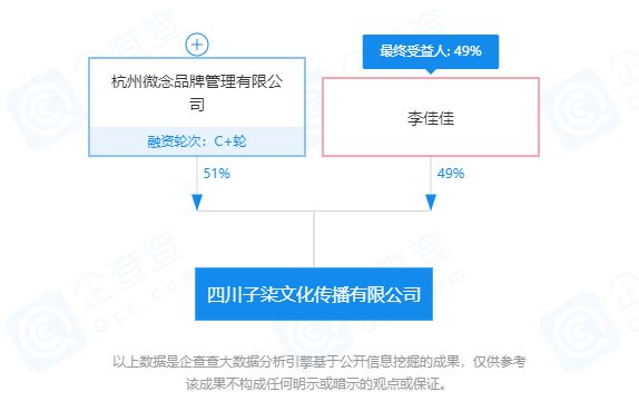 2017年7月20日,李佳佳与杭州微念联合成立了四川子柒文化传播有限公司,据企查查数据显示,从股权结构来看,微念占据51%,李佳佳个人占据49%。与此同时,李佳佳就将“李子柒”这个品牌授权给了杭州微念。