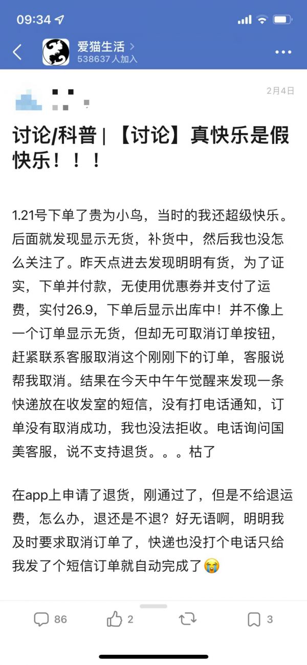 曾有用户在豆瓣发帖称,今年1月21号在真快乐上下单了一个商品,下单后想取消却没有取消的选项,随即联系了客服。客服承诺取消后,该顾客最终还是收到了商品,想要退货时,客服却表示不支持退货。直到2月8日,该用户最后一次更新该帖,问题仍未得到解决。